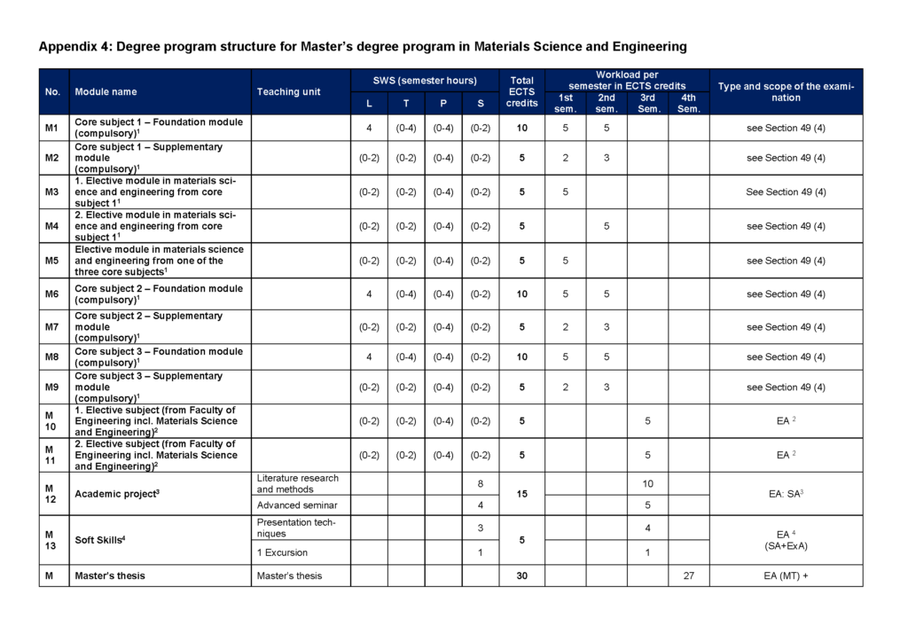 In addition to the core subjects, two elective modules (M10 and M11) must be taken, which include lectures and seminars, each worth 5 ECTS credits. The modules M10 and M11 can be taken from the offer of the Department of Materials Science and Engineering as well as from the offer of the other departments of the Faculty of Engineering. The purpose of the electives is to enable students to deepen and broaden their expertise in the field of materials science and materials engineering on current issues in the respective specialties and to sharpen their profile with regard to their intended future career field. Core subject basic and supplementary modules cannot be used as electives.